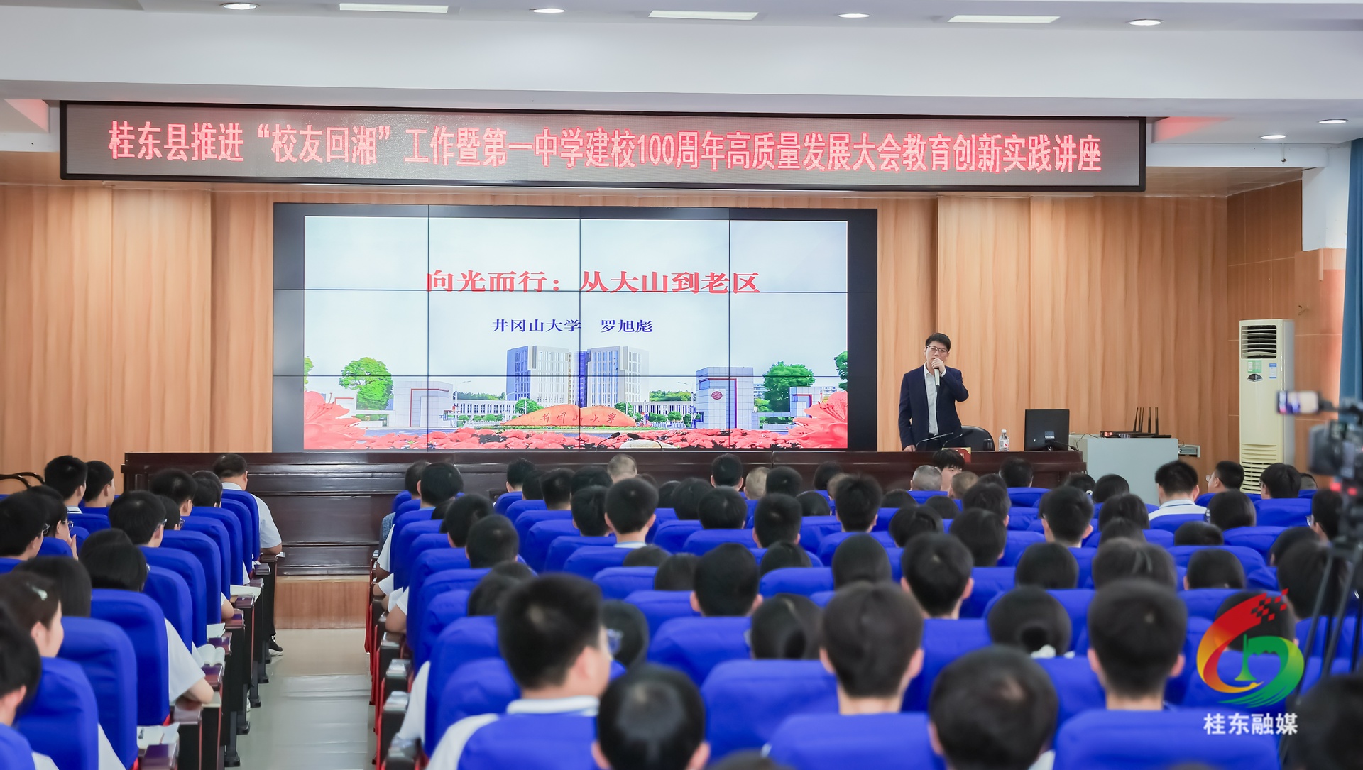 桂东县融媒体中心10月18日讯(记者 钟韬 李涛)百年学府逢盛事,教育创新启新程。10月18日下午,桂东县推进“校友回湘”工作暨第一中学建校100周年高质量发展大会教育创新实践讲座在县一中举办。井冈山大学党委书记、桂东一中校友罗旭彪应邀主讲,县委副书记、县长尹建恒主持讲座。