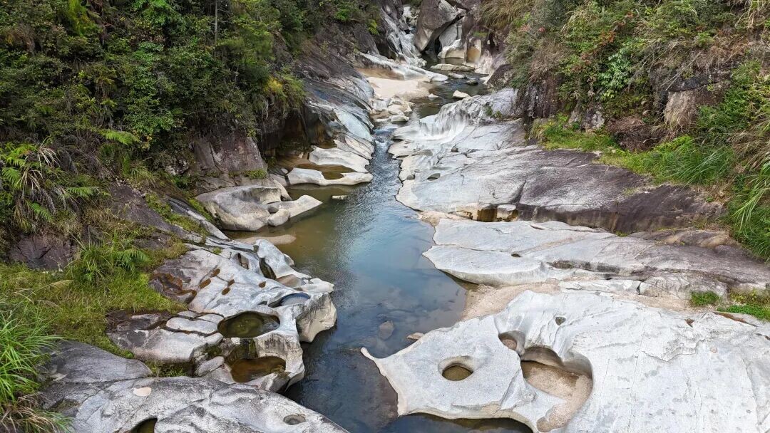 及至涧边,视野豁然开朗,一幅地质的奇景,便毫无保留地铺展在眼前。但见一条清冽的溪流,如一条碧绿的罗带,又似一匹流动的翡翠,在嶙峋的乱石间宛转流淌。而我的心神,立刻便被溪床中那些星罗棋布的、形态奇崛的石头攫住了。此时,湖南宏踏投资有限公司及桂东三台山度假酒店的董事长曾玉波先生,走上前来,向我和钟敏会长做起了介绍。他是一位对家乡山水怀着深厚感情的企业家,言语沉稳而充满热忱。他伸手指点着溪中那些奇特的石臼,告诉我们,这便是形成于距今约两三百万年前的第四纪早期冰川作用的冰臼,是古冰川遗迹的珍贵见证。