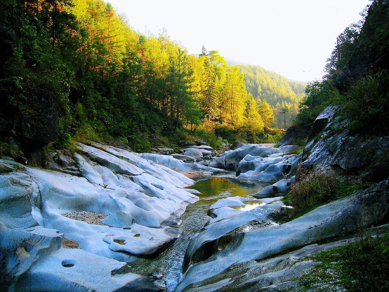 我们沿着溪流缓缓上行,景色愈发奇绝。在一处较为开阔的河段,一片巨大的、微微倾斜的花岗岩岩床上,密布着上百个大小不一的冰臼,它们相互叠压、贯通,构成了一个庞大的、迷宫般的“石臼群”。清浅的溪水流过这片岩床,时而分成数股,在白石间蜿蜒;时而汇入臼中,形成一个个小小的、旋转的涡流;时而又从连接处悄然溢出,形成一道道薄薄的水帘。阳光直射下来,水面波光粼粼,臼底的彩石斑斓可见。光影在水波和石壁之间跳跃、折射,明暗交错,虚实相生,仿佛整个河床都在微微晃动,流淌着一曲光与影的旋律。我们站在这片奇异的岩床上,仿佛不是站在坚实的地面,而是站在了时间的河床上,脚下流淌的,是数百万年的地质历史。