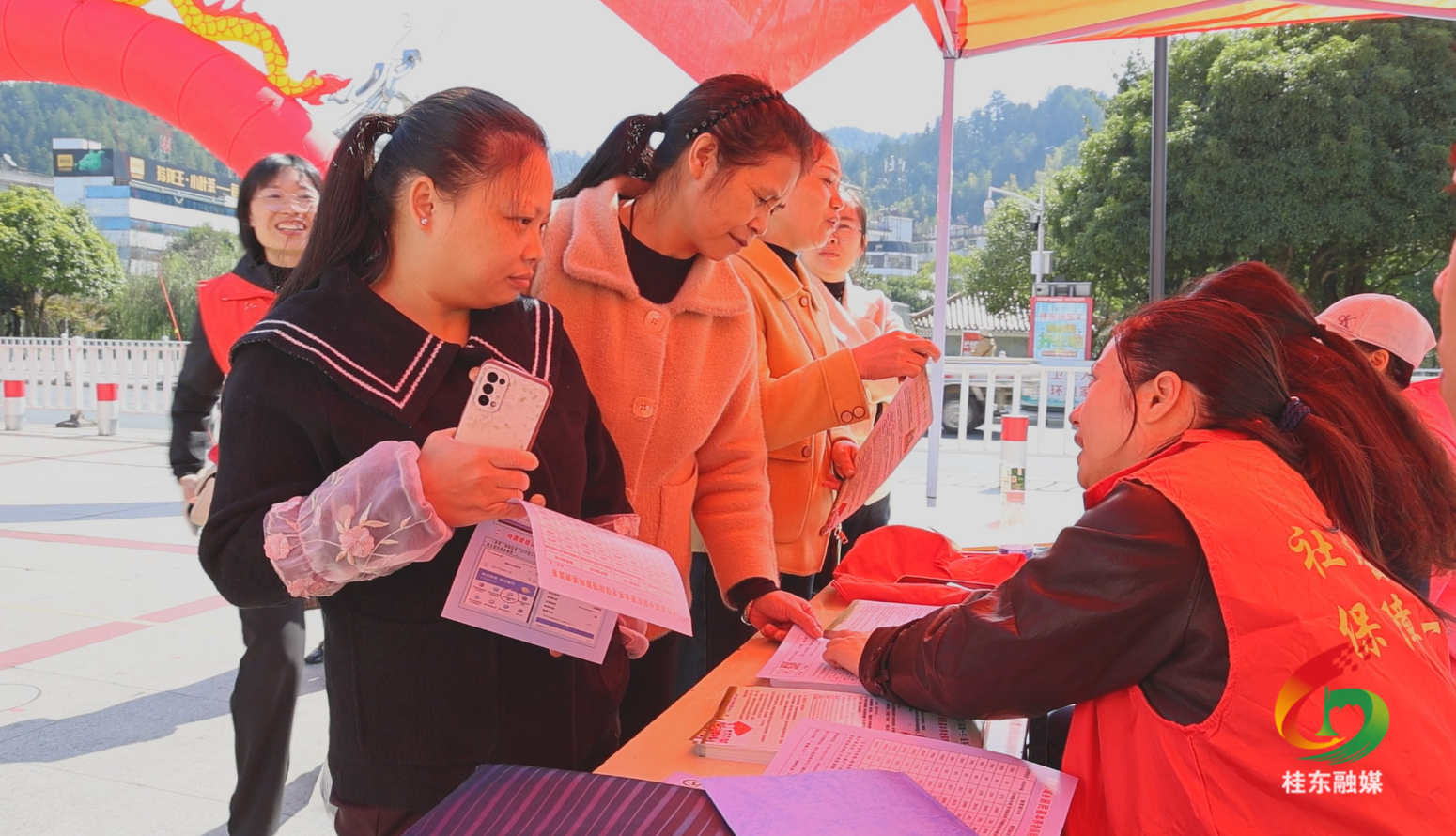 现场同步开展了集中宣传活动。县人社局、医保局、税务局及多家驻桂银行协同联动,通过设置政策咨询台、悬挂宣传横幅、发放政策解读手册等方式,围绕养老保险、失业保险、工伤保险、医疗保险、生育保险等重点险种,为过往群众提供面对面的政策解读,详细说明参保缴费标准、待遇申领流程等关键内容。多家银行还现场设立了社保卡即时制卡服务点,为群众提供便捷的社保卡办理和换领服务。