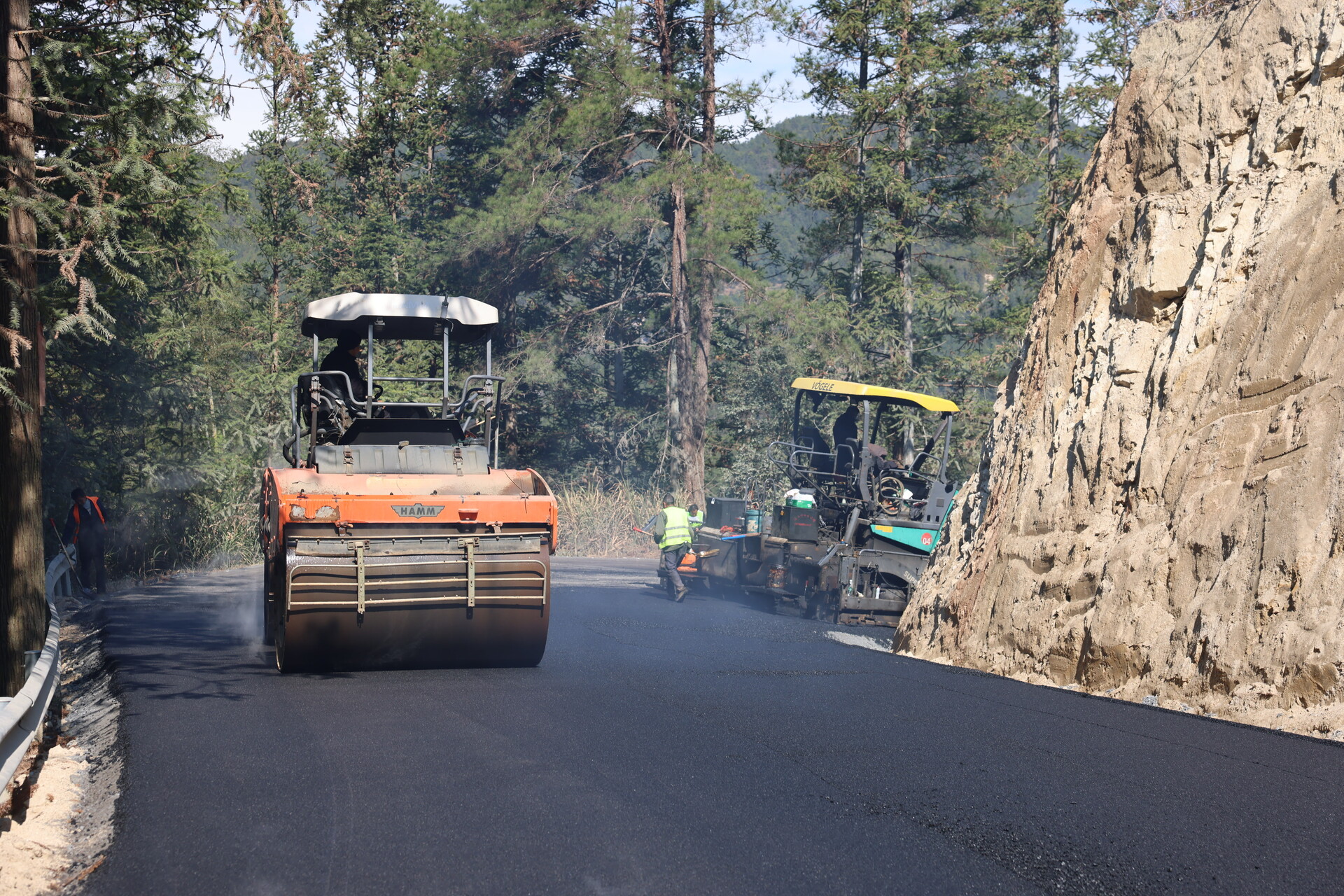 记者在X127线新坊至龙溪瀑布路口段看到,沥青摊铺机正缓缓前行,将滚烫的沥青均匀地吞吐而出。压路机紧随其后,来回碾压,将路面熨帖得平整而坚实。现场热浪蒸腾,机器轰鸣,一派热火朝天的施工景象。