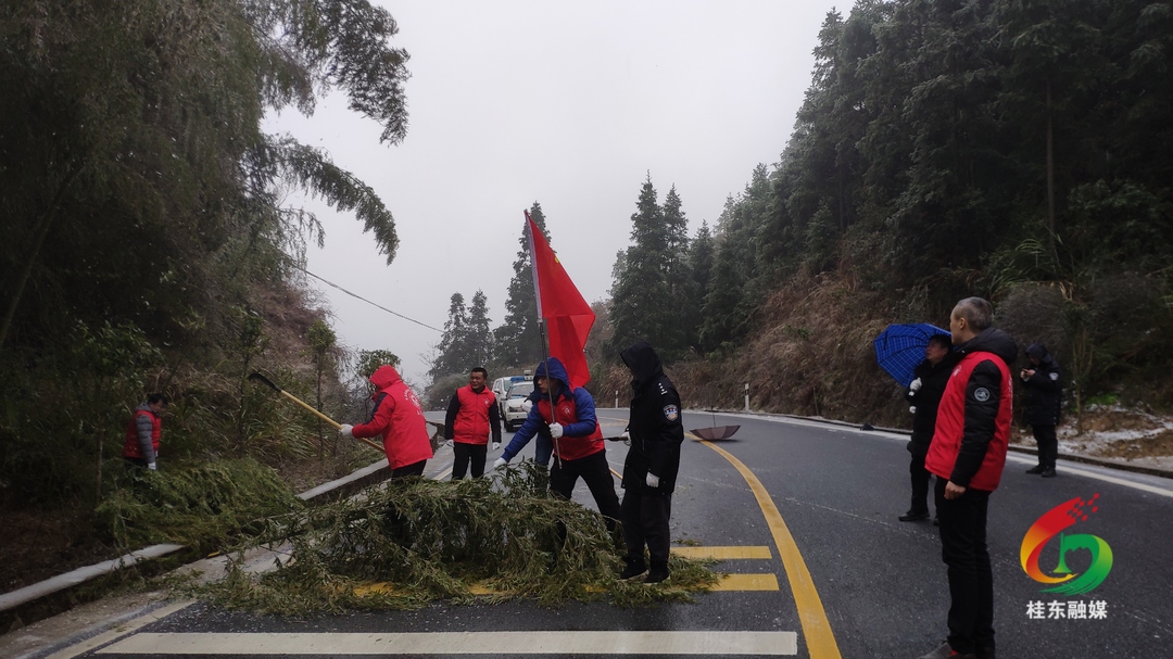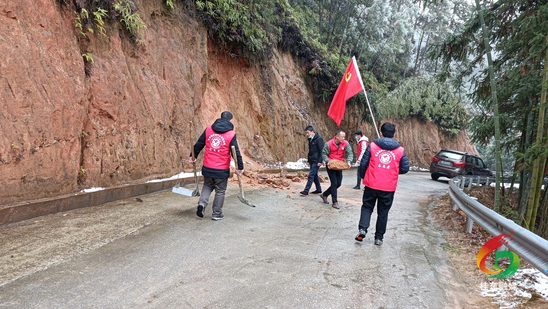 在S352清泉镇牛岗圩主干道上,党委副书记杨昕带领工作人员身着红马甲,化身"守护神",广泛发动广大群众一道,手持锹铲、柴刀,在冰天雪地中铲除路面冰雪,砍断被冰雪压倒的竹木,清理山体的滑落物,确保了该主干道始终畅通无阻;在秋坪村,党旗飘扬的疫情咨询服务点迅速补充职能,转变成为24小时值班的"交通劝导+疫情防控"综合服务点,成为了预防交通事故的前线哨所;在高海拔的夏丹社区、庄川村和中坑村部分小组,村务员和志愿者们头顶"风雪帽"、脚踏"冰墩鞋"保障道路畅通,走村入户走访留守老人户、开展住房安全巡查、地质灾害隐患排查等工作。