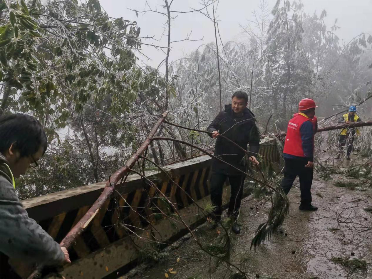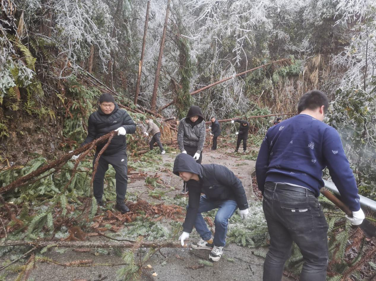 桂东县融媒体中心2月23日讯 (通讯员 崔健)近日,青山乡彩洞村出现大范围冰冻雨雪天气,冰冻雨雪压垮了路边树木,造成村主干道全线受阻,部分高压线路损坏,为确保人民群众的生产生活。青山乡党委政府联合乡供电所,组织村支两委、组长、护林员、公路养护员等多支力量,对彩洞近6公里的塌方路段进行全面疏通清理。