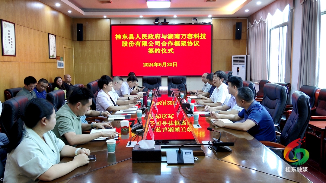 桂东县融媒体中心6月21日讯(记者 钟韬)6月20日下午,县人民政府与湖南万容科技股份有限公司举行合作框架协议签约仪式。县委副书记、县长刘真出席并见证签约。县委常委、常务副县长李攀,万容科技董事长明果英分别代表双方进行签约。
