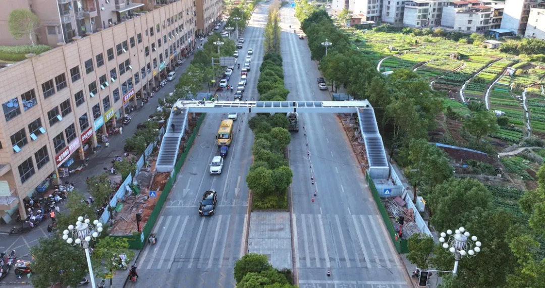11月19日,郴州宜章,湘南红军学校门口西侧,横跨宜章大道的人行天桥——“捷利二桥”吊装完桥身。