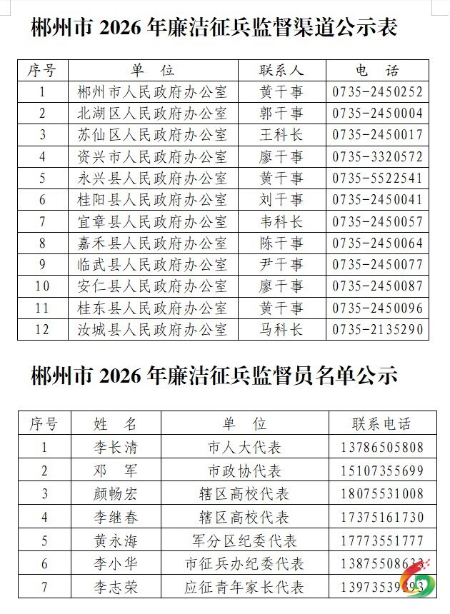 为确保征兵工作公平公正、阳光透明,郴州市人民政府征兵办公室现将2026年度廉洁征兵监督举报渠道公示如下,如出现廉洁征兵问题,请广大群众积极提供线索: