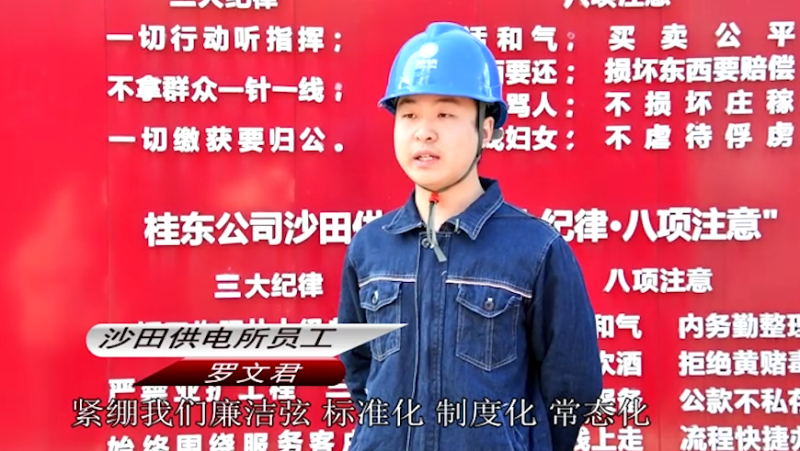 沙田供电所员工罗文君:供电服务“三大纪律 八项注意”给我们工作定了标尺,紧绷我们廉洁弦,标准化、制度化、常态化,这种纪律规矩意识已经深入我们的心里。