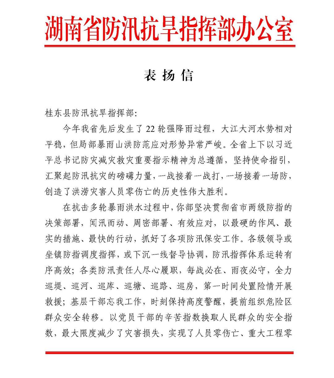 桂东县融媒体中心10月11日讯(记者 黄莎娜)10月10日,我县收到湖南省防汛抗旱指挥部办公室的表扬信,对我县今年以来的防汛工作给予充分肯定。