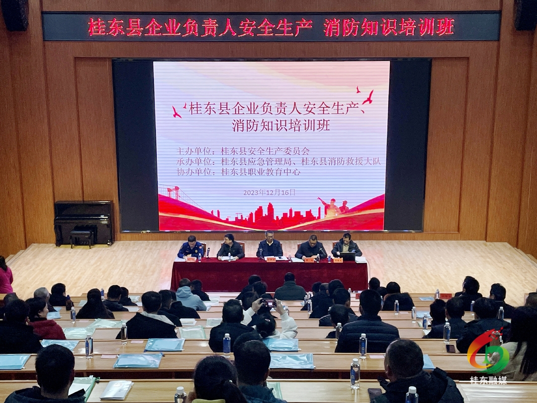桂东县融媒体中心12月16日讯(记者 钟凤侣)12月16日,县应急管理局、县消防救援大队组织开展安全生产和消防知识培训,深入学习贯彻习近平总书记关于安全生产重要论述和重要指示批示精神,认真落实国务院安委会“十五条”硬措施,进一步压实企业安全生产和消防安全主体责任,提升企业安全红线意识,强化企业安全管理能力。副县长谷新波出席活动。全县各乡镇分管负责人和企业主200余人参加培训。