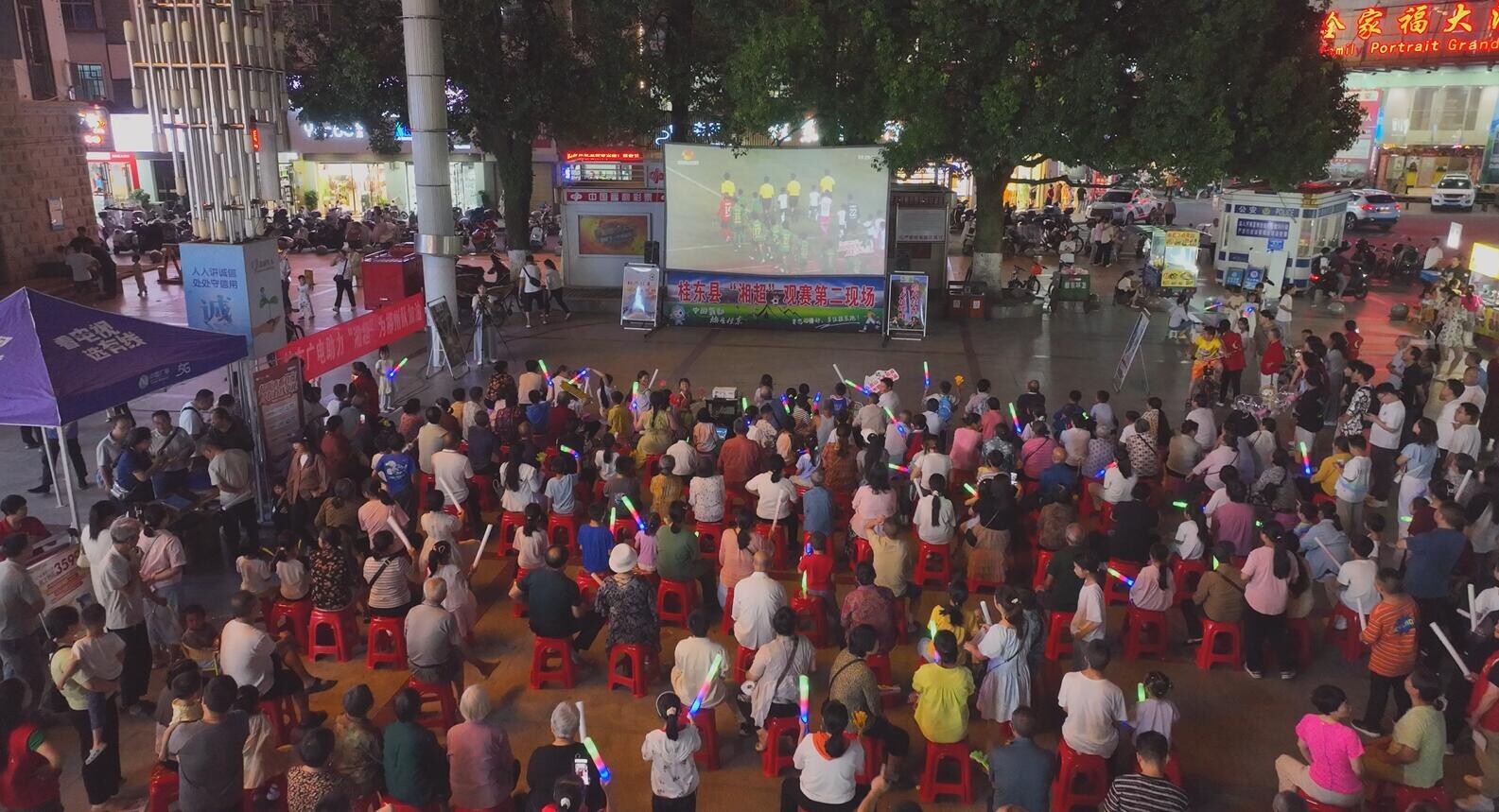 晚上7点半,比赛正式开始,罗霄广场和8090餐厅的大屏同步直播,两处现场气氛热烈,球迷早早聚集,隔空为郴州队呐喊助威。在罗霄广场,球迷们坐在小马扎上,手中助威棒不停挥动。比赛精彩激烈,每一次精彩传球、每一次抢断、每一脚射门、每一次飞身扑救,都能引来雷鸣般的欢呼。而在8090餐厅,大家手持荧光棒和定制助威道具,全程紧盯着比赛进程。攻防转换扣人心弦,震耳欲聋的掌声与欢呼不绝于耳。