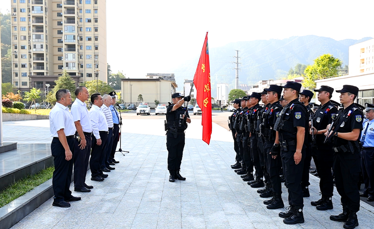 桂东县融媒体中心10月1日讯(记者 邓敏 谢林 通讯员 罗晶)10月1日上午,桂东县公安局新业务技术大楼前坪旗帜飘扬、警徽闪耀,县公安局“云豹突击队”授旗仪式在此庄重举行。县委书记蔡富强出席仪式并为“云豹突击队”授旗。