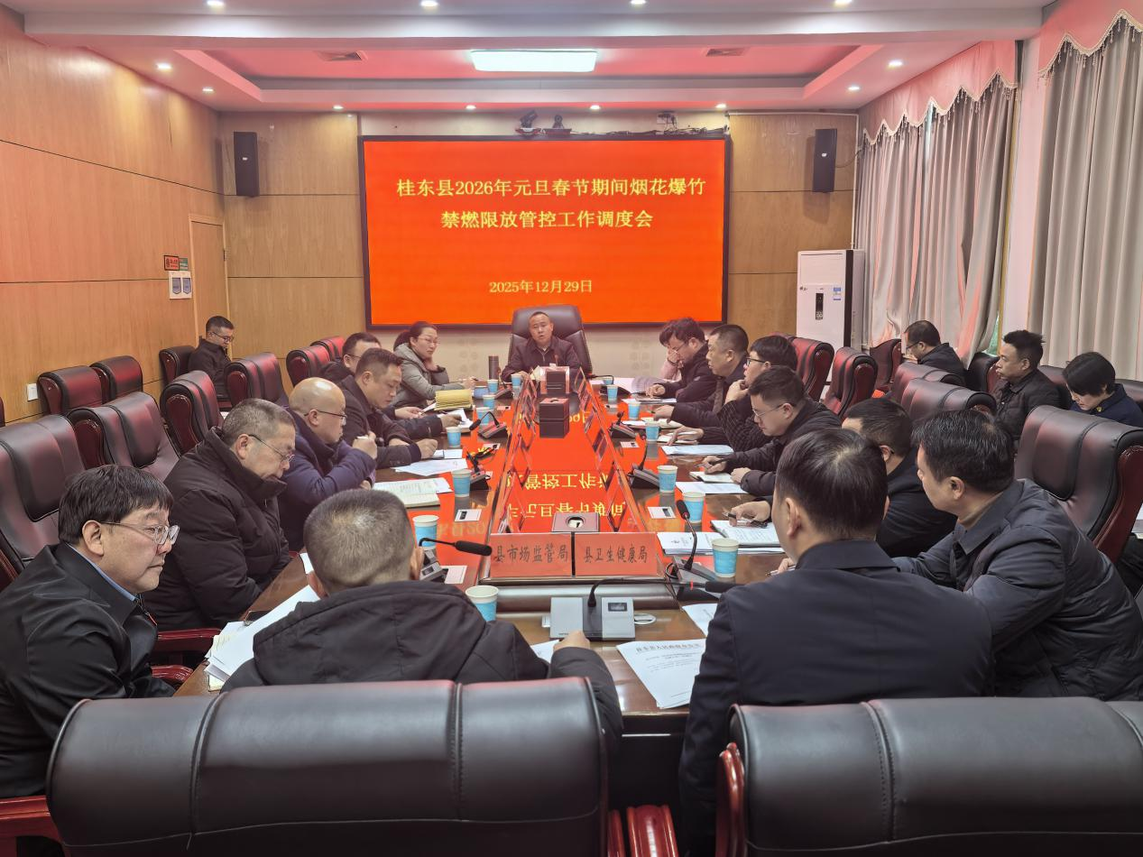 桂东县融媒体中心12月29日讯(通讯员 钟卓文)12月29日,桂东县召开2026年元旦春节期间烟花爆竹禁燃限放管控工作调度会,认真落实省、市相关要求,细化部署下一步重点任务。县委常委、常务副县长龙彪出席并讲话,副县长陈静雯主持会议。