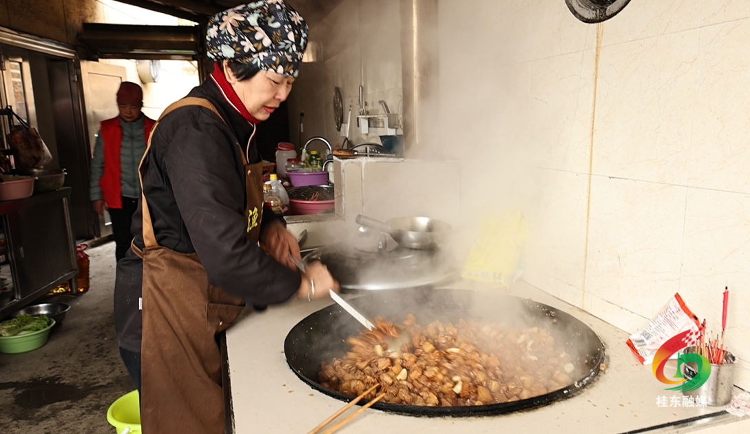 灶堂里火苗跳跃,热气扑面而来,铁锅中油花欢快翻滚。当切好的新鲜猪肉滑入锅中,随着滋滋作响,浓郁的香气瞬间弥漫开来。村民们分工有序,切菜、传料、炒菜,配合得默契十足。不一会儿,辣椒炒肉、红烧肉、桂东黄糍粑、清炒高山包菜等地道农家菜便陆续上桌,热气腾腾,满院飘香。