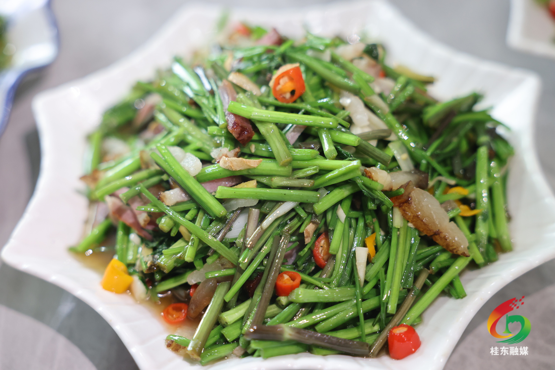 刚采摘的水芹菜,无需复杂调味,最简单的家常做法,就能把春日鲜味发挥到极致。当地厨师现场展示了两款经典吃法,都是桂东人餐桌上的春日标配。水芹菜炒腊肉堪称黄金搭档,先把新鲜水芹择去老叶、洗净切段,腊肉切片煸炒出油脂,蒜片、干辣椒爆香后,下入水芹大火快炒,少许盐调味即可出锅。腊肉的咸香醇厚,中和了水芹的清鲜脆嫩,油润不腻,一口下去,满嘴都是烟火气与春味。水芹菜炒香干主打一个清新爽口,香干切细条,和水芹段一同入锅快炒,加少许蒜末、生抽提鲜,成菜咸鲜脆嫩,完全保留春蔬本味,解腻又下饭,是春日餐桌的必备素菜。